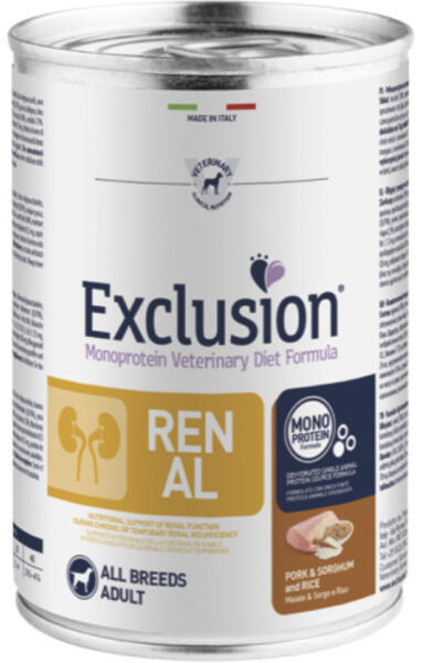 Az Exclusion Diet Renal Pork and Sorghum and Rice felnőtt ebek részére készült teljes, dietetikus élelem, veseműködés serkentő hatású krónikus vagy időszakos veseelégtelenség esetén. Ez a dietetikus élelem alacsony foszfor tartalmú és csökkent mennyiségben minőségi proteint tartalmaz. RENAL: étrendi támogatás krónikus vesebetegség, illetve átmeneti veseelégtelenség