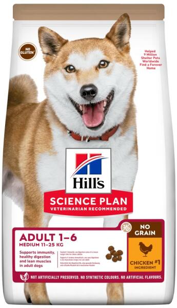 A Hill's Science Plan NO GRAIN MEDIUM ADULT KUTYATÁP CSIRKÉVEL teljes értékű eledel 1-6 éves felnőtt, közepes testű kutyák részére. ÖSSZETEVŐK: Csirkehúsliszt (25%), burgonyakeményítő, szárított burgonya, szárított borsó, sárgaborsó, állati zsiradék, hidrolizált fehérjekivonat, növényi olaj, lenmag, ásványi anyagok, szárított cukorrépapép, szárított sárgaré