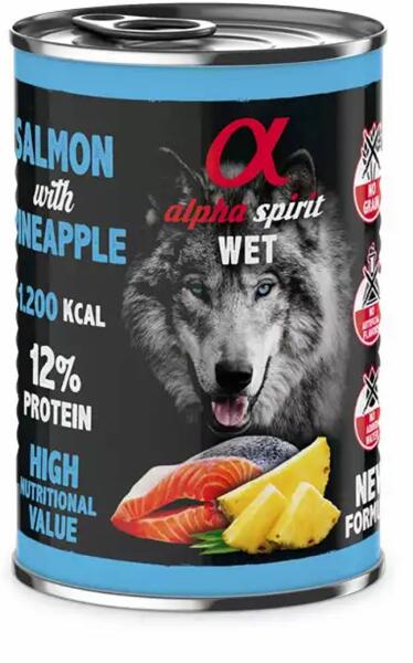 Az Alpha Spirit teljes értékű nedves eledel minden korosztályú kutyának friss lazaccal és ananásszal. Elérhetően 93% állati fehérjét tartalmaz, hozzáadott víz nélkül cink és ízületi táplálék az egészséges bőrért, szőrzetért és funkcionális mozgásszervekért nem tartalmaz glutént, keményítőt vagy mesterséges színezéket a táplálóbb formula javítja az emész