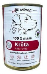 All Animals DOG pulykahús darált 400g, Teljes értékű, gabonafélék nélküli nedves eledel, 100%-ban állati fehérjeforrásként feltüntetett állati fehérjével. Máriatövisolaj hozzáadásával. Cseh tenyésztésből származó darált pulyka hozzáadott összetevők nélkül. A pulyka gazdag forrása az emészthető fehérjéknek, magas nyomelemtartalommal. B 3 és B 6 vitaminokat tar