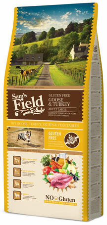 26kg A Sam's Field Gluten Free Adult Large Goose & Turkey egy teljesértékű minőségi szárazeledel nagytestű, felnőtt kutyák részére. Libával és pulykával, valamint zöldségek és gyümölcsök hozzáadásával készül melyek támogatják az immunrendszert. Gabona- és gluténmentes kutyatáp. Magas tápanyag tartalom a tökéletes emészthetőségért, glükozamin és kondroitin