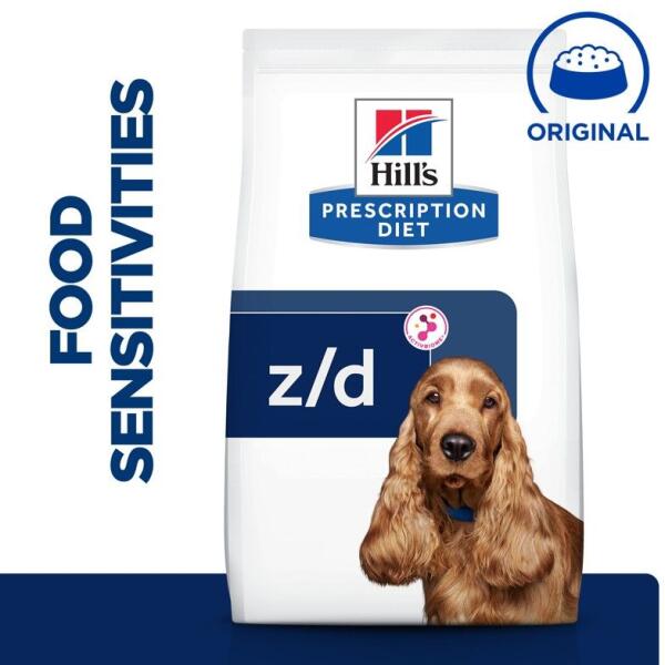 Hill's PRESCRIPTION DIET z/d kutyaeledel. Az eleségérzékenység és intolerancia potenciálisan súlyos problémák, melyek a bőr, a szőrzet és a fülek megbetegedédését okozhatják vagy akár emésztőszervi tüneteik is lehetnek. A kutyák eleségérzékenységtől vagy intoleranciától is szenvedhetnek, melyeket más néven káros eleségreakcióknak is neveznek és amelyeket rendszer