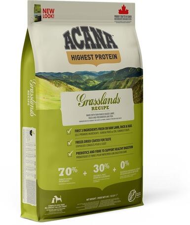 22.8kg Az Acana Grasslands Dog egy teljes értékű gabonamentes kutyatáp. Új-zélandi bárány, a friss tojás, a vadon halászott északi süllő és csuka biztosítja a könnyen emészthető fehérjék széles választékát. A dús fűvel borított legelők és a kanadai északi tavak inspirálták az Acana Grasslands kifejlesztését. A fehérjék és zsírok széles választékát garantá