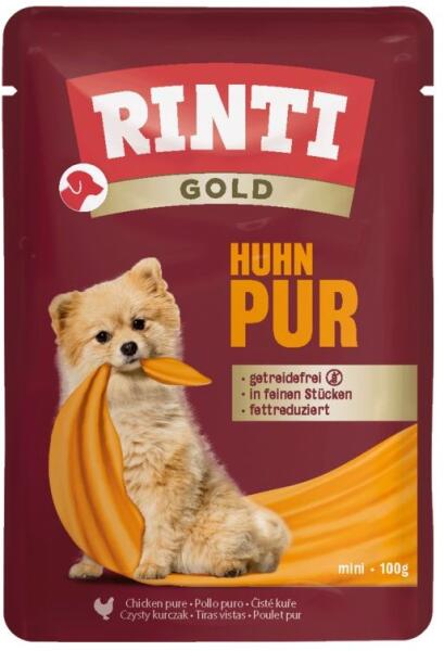 RINTI GOLD PUR prémium kapszula egyetlen fehérjeforrással, alkalmas kis termetű kutyák számára. tiszta csirke csökkentett zsírtartalmú könnyen emészthető szója, színezék- és aromaanyagoktól mentes gabona mentes öss zetevők: 60% csirkehús (izom, máj, gyomor), ivóvíz, ásványi anyagok, lenmagolaj, cékla rost Analitikai összetétel: fehérje 10%, olajok és zsírok 6%, hamu
