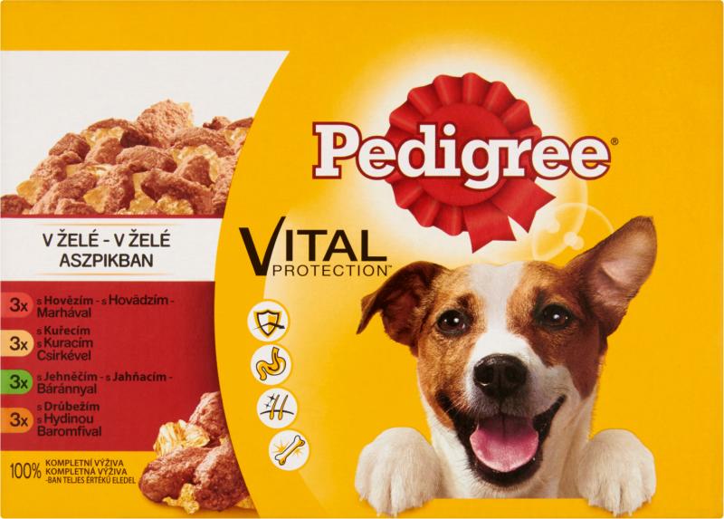 Pedigree Wet Jellied felnőtt kutyatáp marhahússal, csirkével, bárányhússal, baromfival 12x100g - Termékleírás Minden kutya megérdemli az igényeire szabott eledelt. Válassza a Pedigree Vital Adult 12x100g - nedves kutyatáp csirke, bárány, baromfi, marha zselében, amely bármilyen fajtájú felnőtt kutyák számára készült. Jól működik kiegészítő etetésként, mind a szár