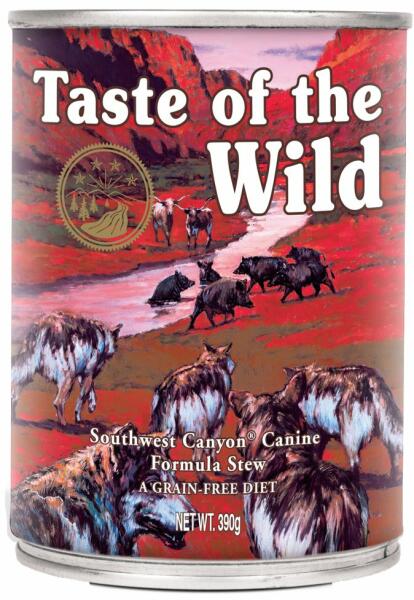 Taste Of The Wild Southwest Canyon (konzervdoboz) 390g - Termékleírás Nedvestáp minden korú és fajtájú kutyának, marhahús ízű pörkölt zöldségekkel és gyümölcsökkel. Kiváló, jól emészthető marhahúsfehérjét és könnyen emészthető energiát biztosít a kutyák számára. A legmagasabb minőségű, kíméletes összetevőinek köszönhetően a táp kölyökkortól haszn