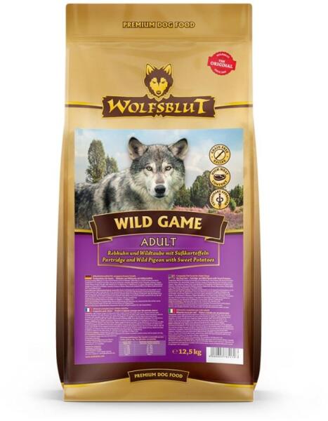 Vadmadarak, mint fő összetevők. Természetes vitaminok tengeri moszatból és áfonyából. Gabona nélkül, mivel nem fordul elő a kutya őse természetes zsákmánymintájában, és egyben az egyik leggyakoribb allergia kiváltó ok a kutyáknál. Értékes superfoodokkal, mint például szeder, bodza, aróniabogyó, valamint gyermekláncfű és ginzeng. Wolfsblut Wild Game Adult – Fogoly