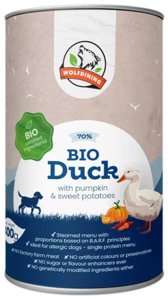 69% BIO KACSAHÚS OS párolt menü bio sütőtökkel és bio édesburgonyával gazdagítva, bio lenmagolajjal. Kizárólag friss hús, bio zöldség és gyümölcs feldolgozásával , amelyeket kontrollált, alacsony hőmérsékleten párolnak készre az értékes tápanyagok és az ízek megőrzéséért. Teljes értékű menü felnőtt kutyáknak. A kutyák ragadozó emésztőrendszere legkönny