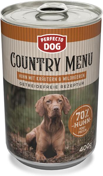 Perfecto Dog Country Menu Prémium Paté csirke gyógynövényekkel és vadbogyókkal 400g - Prémium nedves táp felnőtt kutyáknak - 70% csirke - Monoprotein - Gabonamentes recept. Prémium pástétom csirke fűszernövényekkel és erdei bogyókkal. Teljes értékű táp felnőtt kutyák számára. Gabonamentes formula. Nem tartalmaz tartósítószert, mesterséges színezéket és mestersége