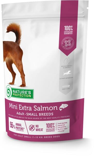 Natures Protection Dog Mini Extra Salmon 500g Lazacban gazdag teljes alattállat felnőtt kis fajtású kutyáknak 100%-ban teljes értékű és kiegyensúlyozott táplálkozás, hogy kutyája optimális állapotban maradjon. Csökkentheti az allergiás tüneteket. A fő fehérjeforrás a kiváló minőségű lazac, amely különösen előnyös az egészséges szőrzet és bőr megőrzésében, va