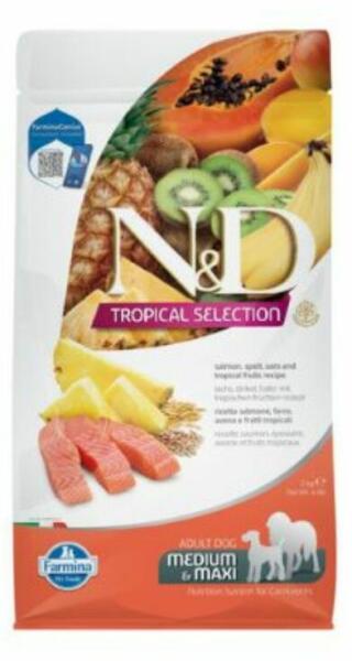 N&D Tropical Selection Dog Salmon Adult Medium & Maxi 2kg – Trópusi Gyümölcsökkel és Lazaccal Készített Kutyatáp Az N&D Tropical Selection Dog Salmon Adult Medium & Maxi egy prémium száraztáp, mely kifejezetten közepes és nagytestű felnőtt kutyák számára készült. A csirkehúsmentes recept lazacot és trópusi gyümölcsöket tartalmaz, egyedülálló ízélmé