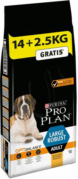 Purina PRO PLAN ADULT Large Robust teljes értékű eledel magas csirkehús és rizs tartalommal, robusztus minden fajta felnőtt kutyának (felnőtt testtsúly 25 kg felett), mint a Basset hound, berni pásztor, bloodhound, bullmasztiff, komondor, mastiff, újfunlandi kutya, rottweiler, bernáthegyi... A robusztus kutyafajtáknak lassabb az anyagcseréje, kevesebb energiát fogyasztanak. Ez az el
