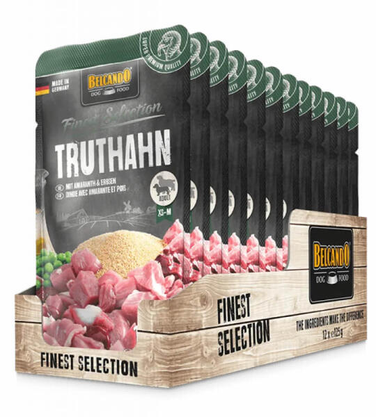 Pulykahús amaránttal és borsóval 125g BELCANDO® FINEST SELECTION kutyaeledelKiváló receptúrák egy etetési méretben csomagolva. Szaftos, finom hozzávalókkal ízesített, kíméletesen főzött hús, tasakba kiporciózva. A hidegen sajtolt bogáncsolaj létfontosságú telítetlen zsírsavakat ad hozzá. A BELCANDO® FINEST SELECTION rendkívüli ízletességének és hasznosíthatós