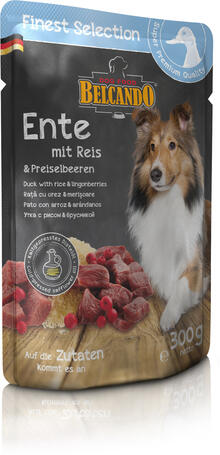 1.8kg A Belcando Finest Selection kacsahús rizzsel és vörösáfonyával egy kiváló minőségű tasakos nedves eledel kutyája számára. Szaftos, finom hozzávalókkal ízesített, kíméletesen főzött hússal. A hidegen sajtolt bogáncsolaj létfontosságú telítetlen zsírsavakat ad hozzá. Rendkívűl ízletes és jól hasznosítható, melyeknek köszönhetően kiválló az érzékeny