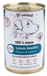All Animals DOG lazac darabok 400g, Teljes értékű, gabonafélék nélküli nedves eledel a 100%-ban bejelentett állati fehérjeforrással. Máriatövisolaj hozzáadásával. Lazacdarabok hozzáadott összetevők nélkül. Nem tartalmaz semmilyen kémiai vagy tartósító adalékanyagot. Alkalmas minden kutyafajta és korosztály számára. összetevők: lazac. A termék szója- és gabonafél