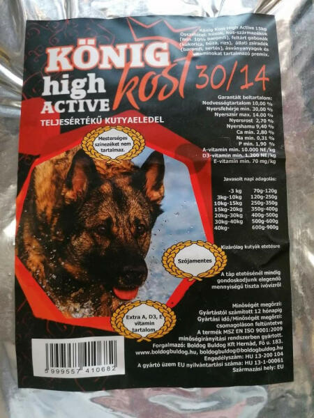 Teljes értékű eledel fokozott igénybevételű kutyák számára. Összetétel: húsok, hús-származékok, (min. 10% baromfi), feltárt gabonák(kukorica, búza, rizs), állati zsiradék(baromfi, sertés), ásványi anyagok és vitaminokat tartalmazó premix. Garantált beltartalom : Nedvességtartalom: 10% Nyersfehérje min. : 30% Nyerszsír max. : 14% Nyersrost: 2,70% Nyershamu: 9,40% Ca min