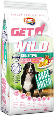 30kg A GetWild Dog Adult Large Breed Sensitive Lamb & Rice with Apple táp kiváló választás a legtöbb érzékeny gyomrú és bőr- vagy szőrproblémákkal küzdő nagytestű kutya számára. Csirkét, búzát és tejterméket, sőt tojást se tartalmaz, így megoldást kínálhat az öt leggyakoribb ételallergiából négyre. További értéknövelője, hogy ízületvédőt is tartalmaz