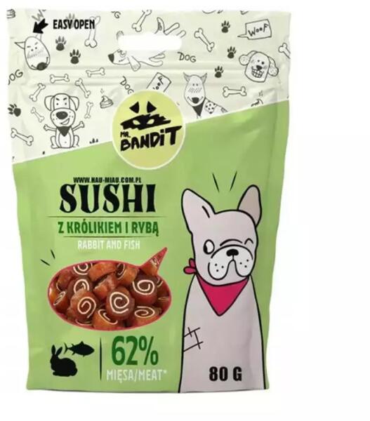 MR. BANDIT Trainer Treats SUSHI KINGFISH 80g A Mr. Bandit Sushi nyúllal és hallal egy ikonikus jutalomfalat, amely a zsenge nyúlhúst és az aromás tőkehalat ötvözi. Az apró, puha falatkák tökéletesen működnek motivációként és jutalomként a ravasz trükkök tanulásakor. A rágás és harapdálás kutyája mindennapjainak része - megerősíti ezeket az ősi ösztönöket és eg