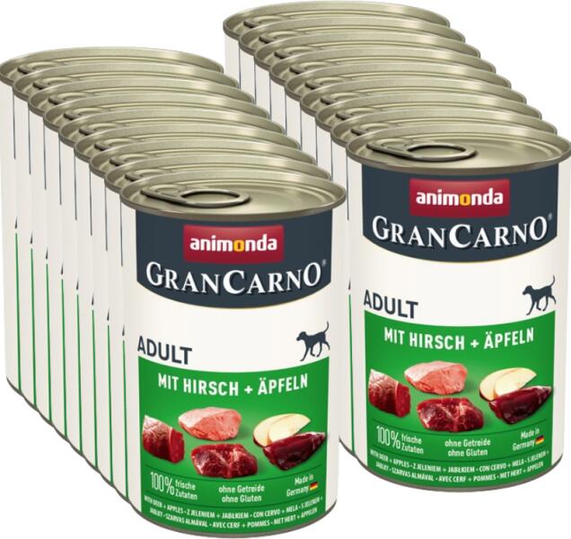 ANIMONDA Grancarno Adult kutya ízesítés: Szarvas + alma 400g Rendeltetésszerű használat: Teljes értékű eledel felnőtt kutyák számára. A termék előnyei: Az Animonda Grancarno Dog a legjobb minőségű húsból készül, szaftos, egész darabokban, hozzáadott gabona és szója nélkül. Az Animonda GranCarno kizárólag friss húsból készül, így nagymértékben megőrzi annak sze