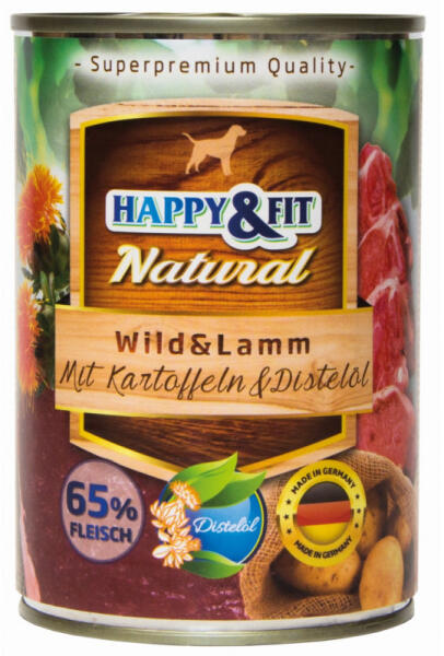 A Happy & Fit Natural Dog Kutyatáp Konzerv Vadhússal és Bárányhússal Burgonyával és Sáfrányos Szekliceolajjal 400g kifejezetten felnőtt kutyák számára készült. Ez a prémium minőségű kutyatáp ideális választás érzékeny emésztésű, táplálékallergiára hajlamos, és válogatós kutyák számára. A Happy & Fit Natural Dog Kutyatáp Konzerv Vadhússal és Bárán