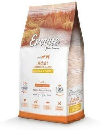 24kg Visán Evoque Dog Adult Medium/Large Chicken & Turkey with Fruits & Vegetables (26/14) teljes értékű eledel csirke- és pulykahússal közepes (12 hónapos kortól) és nagytestű (18 hónapos kortól) felnőtt kutyák számára.