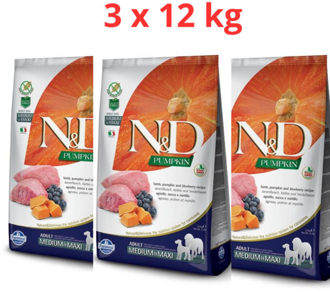 Kiszerelés: 3 x 12kg Teljes értékű, gabonamentes eledel báránnyal, sütőtökkel és áfonyával közepes és nagytestű felnőtt kutyák részére. Kiszerelés : 3 x 12 kg Közepes és nagytestű felnőtt kutyáknak bárányhúsból készített teljes értékű gabonamentes kutyatáp áfonyával, sütőtökkel , gyógynövényekkel (útifűvel, kurkumával) , friss gyümölcsökkel(almával