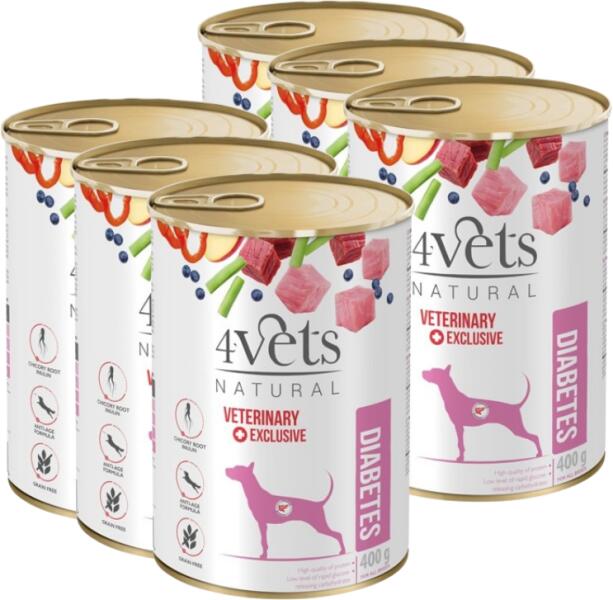 A 4vets Diabetes Veterinary Diet egy teljes értékű diétás kutyatáp, amely a cukorbetegséggel diagnosztizált háziállatok és a sterilizációs műtétet követő túlsúlyos, elhízott kutyák igényeihez igazodik. Az étrendben található rostok és a gyorsan felszabaduló szénhidrátok alacsony szintje segít a kutya vércukorszintjének és testsúlyának szabályozásában. A cukorb
