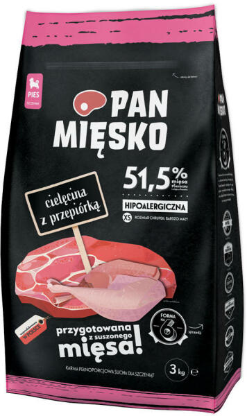 Kölyökborjúhús borjúhússal és fürjjel XS 3kg - Termékleírás Teljes értékű szárazeledel kölyökkutyák és fiatal, kis és miniatűr fajtájú kutyák számára borjúhús és fürj ízesítéssel. Szárított húsból készül. A Pan Mięsko Lengyelországban készül gondosan válogatott szárított húsból és olyan összetevőkből, mint a lengyel alma, zöldségek és tápanya