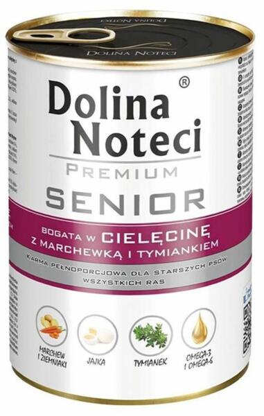 A Dolina Noteci Premium Senior teljes értékű, gabonamentes nedves eledel minden fajta idősebb kutyának, borjúhússal, sárgarépával és kakukkfűvel. borjúhússal, magas teljes értékű és könnyen emészthető fehérjetartalommal a hozzáadott tojás fedezi a megnövekedett fehérjeszükségletet glutén-, mesterséges aroma-, ízfokozó- és színezékmentes gabona mentes, alkalmas t