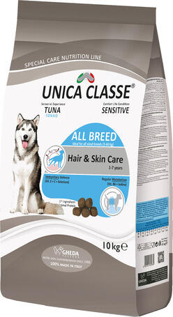 20kg Az Unica Classe Adult All Breed Tuna Sensitive tonhalas kutyatáp legfőképpen a bőr védelmére fókuszál, megerősítve azt a külső környezeti hatások ellen egy védőréteget képezve. Átlagos fizikai aktivitású, közepes testméretű kutyáknak. Egyedülálló ízélményt nyújt. 25%-os fehérje és 15%-os zsír aránnyal. Biztosítja a megfelelő tápanyag egyensúlyt, így me