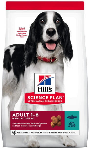 A HILL'S SCIENCE PLAN Medium Adult Tuna & Rice Kutyatápot kifejezetten az erejük teljében levő kutyák energiaigényének kielégítésére fejlesztettük ki. Kiváló minőségű és könnyen emészthető összetevőkből készül. Omega-6 zsírsavak és E-vitamin a gyönyörű bőrért és szőrzetért. Kiváló minőségű fehérjékkel a sovány izomzatért. Könnyen emészthető össz