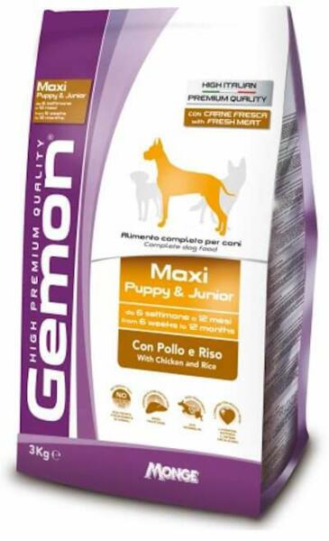 Kutya eledel GEMON Dog Maxi Puppy csirke-rizs száraztáp Teljes értékű állateledel nagytestű és gyorsan növő, kölyök kutyák napi etetésére csirkehússal. Ügyeljen arra, hogy bőséges tiszta ivóvíz mindig álljon rendelkezésre az állat számára. A termék első használatánál fokozatosan vezesse be az étrendbe legalább 1 hét alatt. Az eledel emberi fogyasztásra nem alkalm