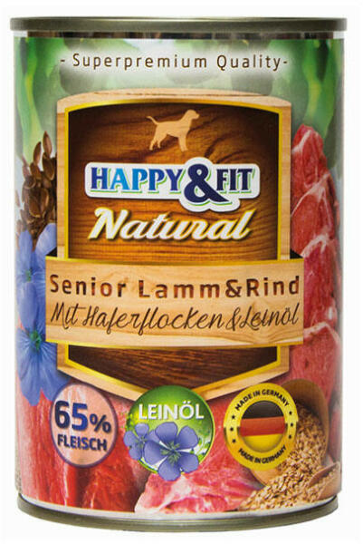 A Happy&Fit konzerv Senior bárány és marhahússal, zabpehellyel és lenmagolajjal további jellemzői: Magas hústartalommal Ízletes, jó minőségű csirke és szarvashússal, almával. Ízletes, jó minőségű bárányhússal és marhahússal, könnyen emészthető zabpehellyel. Lenmagolajjal, amely telítetlen zsírsavakat és nagy mennyiségű Omega-3 és Omega-6 zsírsavakat tartalma