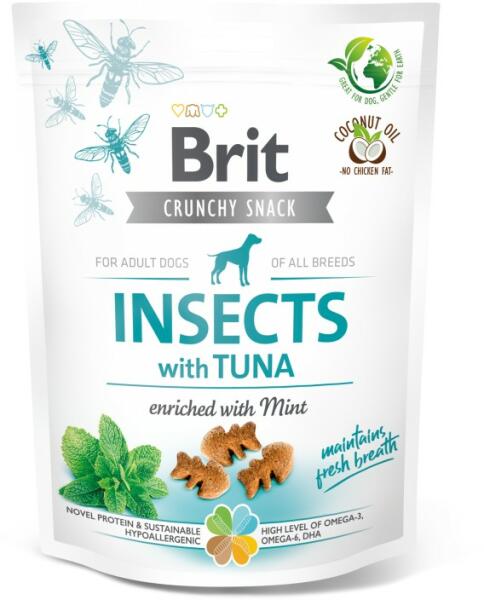 Ropogós csemege rovarfehérjével és tonhallal, mentával dúsítva. Hatékony kiegészítő állateledel kutyák számára, friss lehelletet biztosít. Magas arányú zsírsav-tartalom az egészséges bőrhöz és fényes szőrzethez. Újrahasznosítható csomagolás, alacsony szénlábnyom. Rovari eredetű fehérje – remekül emészthető, túlérzékenység veszélye alacsony. Összetétel: