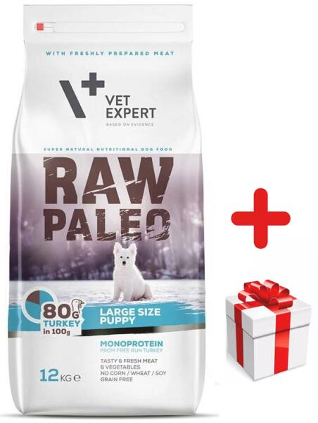 VETEXPERT Raw Paleo Puppy Large 12kg - Termékleírás Teljes értékű, teljes értékű és kiegyensúlyozott eledel nagytestű kölyökkutyák számára elválasztástól 1,5 éves korig. A pulykahús 100 grammonként 80 g könnyen emészthető fehérje- és energiaforrást biztosít, amelyre minden fiatal kutyának szüksége van. A friss hús magas tartalma garantálja a magas ízletességet.