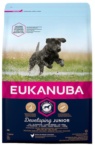 Eukanuba Junior Large kutyatáp 3kg EUKANUBA JUNIOR LARGE LEGFONTOSABB ELŐNYÖK - A DHA segíti a kölykök tanulását, könnyebben képezhetők - Prebiotikus frukto-oligoszacharidok, mannán-oligoszacharidok és cukorrépapép az egészséges emésztés támogatásáért - Antioxidáns E- és C-vitamin az immunrendszer támogatásáért - Kalcium a csontok fejlődésének elősegítésére - Te