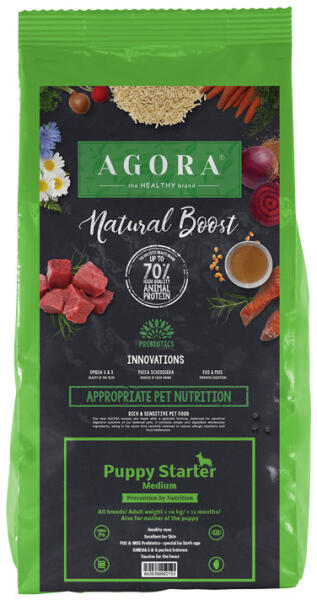 Agora Medium Puppy Starter Teljes értékű eledel 26 és 44 kg közötti súlyú, 2 és 24 hónapos kor közötti, közepes testű kölyökkutyák számáraA közepes vagy magas felszívódású fehérje kiválasztása révén ez egy egyedülálló táplálási megoldás, amely kielégíti az anya és kölykei szükségleteit életciklusuk első öt szakaszában: vemhesség, szoptatás, elválasz