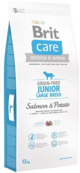 Brit Care Dog Grain-free Junior Large Breed. Lazachúst és burgonyát tartalmazó gabonamentes recept nagytestű (25 kg feletti) kutyafajok fiatal (3 hónapos - 2 éves) egyedei számára. Teljes értékű kutyatáp. Összetevők: lazac (52 %) (dehidratált lazac, hidrolizált lazac), burgonya (26 %), csirkezsír, szárított almapép, lazacolaj (3 %), természetes aromák, sörélesztő, hidroli