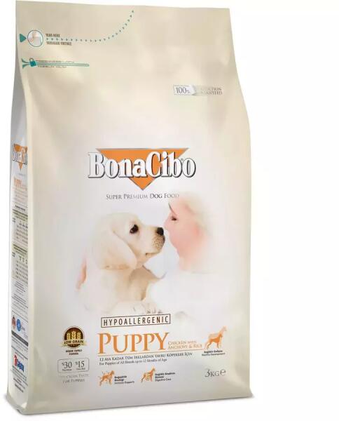 A BONACIBO PUPPY (Csirke, szardella és rizs) 3 kg kutyatáp a kölyökkutyák egészséges növekedését támogatja a fehérjék, zsírok és szénhidrátok optimális keverékével. Omega-3 zsírsavakban, ásványi anyagokban és vitaminokban gazdag, amelyek elősegítik a kölykök egészséges fejlődését. Főbb jellemzők : E gészséges fejlődés : A táp kiegyensúlyozott arányban tart