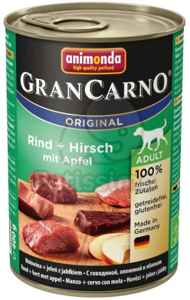 Animonda GranCarno Adult (szarvas + alma) Teljesértékű eledel felnőtt kutyáknak. Kiszerelés: 800 g A kutya köztudottan a farkas leszármazottja. Tizenötezer emberek oldalán töltött év alatt a kutyák jelleme és kinézete rendkívüli változáson ment keresztül. Ezzel ellentétben a táplálkozási szokásaik és igényük a friss állati eredetű nyersanyagokra változatlan maradt.