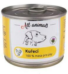 All Animals DOG Csirke darált hús 200g, Teljes értékű, gabonafélék nélküli nedves eledel a 100%-ban bejelentett állati fehérjeforrással. Máriatövisolaj hozzáadásával. Minőségi csirke darált hús, hozzáadott összetevők nélkül. Nem tartalmaz semmilyen kémiai vagy tartósító adalékanyagot. Alkalmas minden kutyafajta és korosztály számára. Összetevők: csirkehús bels