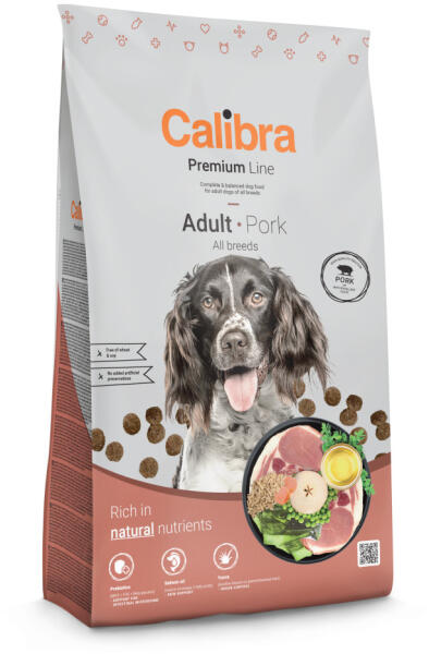 Calibra Dog Premium Adult Pork 12kg Teljes értékű kutyaeledel felnőtt kutyáknak. ? Sertés alapú ? Kukorica + zab ? Lazacolaj – omega 3 zsírsavak forrása ? MOS + FOS + béta-glükánok – prebiotikumok – immunrendszeri / prebiotikus támogatás ? Szójától, színezékektől, tartósítószerektől mentes ? Jukka – illatszabályozás ? Moszat – prebiotikumok és jód természetes