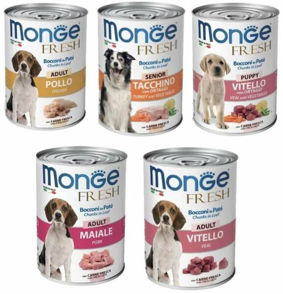 Kutya eledel MONGE Dog Fresh konzerv Teljes értékű állateledel kutyáknak többféle ízesítéssel, többféle korosztálynak. Kiszerelés: 400 g-os konzerv Monge Dog Fresh felnőtt borjú Összetevők - Hús és származékai (friss hús: borjú 26% és csirke 10%) - gabonafélék - olajok és zsírok - ásványi anyagok Analitikai összetevők - Nyers fehérje: 8,0% - Nyers rost: 0,5% - Nye