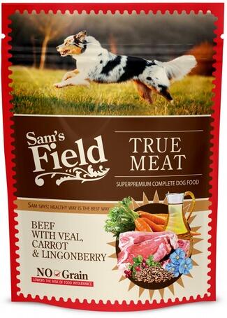 1.56kg A Sam's Field True Meat Lamb with Rice & Pea egy teljesértékű nedvestáp felnőtt kutyák részére, borjúval, répával és vörösáfonyával. Gluténmentes eledel, így az érzékeny emésztésű állatok is fogyaszthatják.