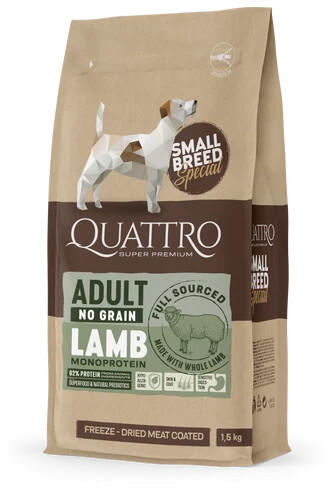 Teljesértékű Hipoallergén száraz eledel kistestű kutyáknak - Fagyasztva szárított, NYERSHÚS- BEVONATTAL! - GABONA MENTES, GMO-MENTES, GLUTÉNMENTES! - Báránnyal FAGYASZTVA SZÁRÍTOTT HÚSBEVONATTAL. A Quattro termékválaszték innovatív "fagyasztva szárított húsbevonat" technológiával készül. Ez az exkluzív megoldás lehetővé teszi, hogy a szemcséket fagyasztva szárítot