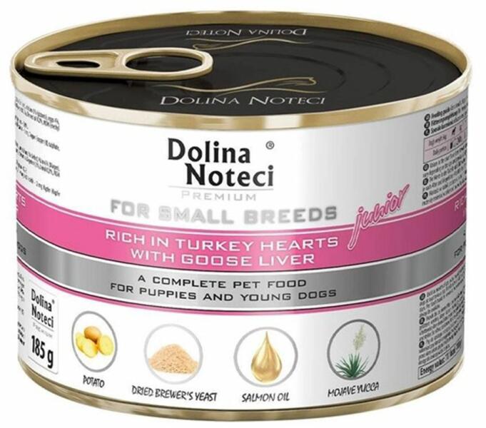A Dolina Noteci Premium Junior Small Breed teljes értékű, gabonamentes nedves eledel fiatal, kistestű kutyák számára, pulykaszívvel és libamájjal. a pulykahús és a belsőségek magas tápértékkel rendelkeznek, viszonylag alacsony kalóriatartalmúak, mégis laktatóak, és kiváló lizin-, triptofán-, metionin- és cisztinforrás a libamáj vasat és szelént tartalmaz - olyan ásv