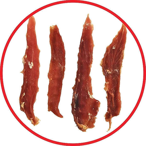 DUCK FILES kutyáknak (kiegészítő eledel) 100%-ban friss kacsahúsból, kémiai tartósítószerek nélkül. 20°C alatti hőmérsékleten és legfeljebb 60%-os relatív páratartalom mellett tárolandó. Védje a közvetlen napfénytől. Felbontás után hűtőben tárolható. Emberi fogyasztásra nem alkalmas termék. Összetétel: 85% kacsahús, só 0,4%, szorbit 1,6%, növényi glicerin 8%,