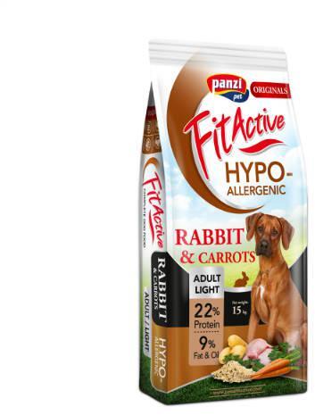 FitActive ORIGINALS – ADULT LIGHT Rabbit Összetétel: Hús- és állati származékok (nyúlhúsliszt min. 12%, sertéshúsliszt min. 6%), kukorica, korpa, szárított cukorrépa, búza, rizs, szárított burgonya (min. 6%), szárított sárgarépa (min. 4%), élelmi rost, kukorica fehérje, zsírok és olajok (marhazsír, lazacolaj), vitamin premix, hal- és halszármazékok (lazacliszt min. 2