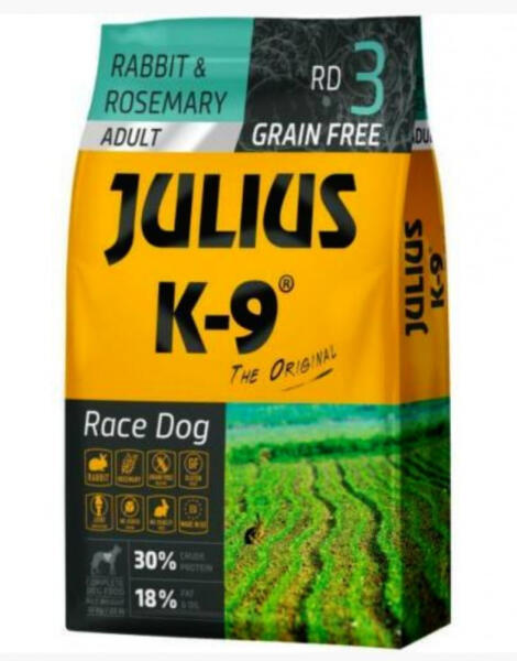 JULIUS K-9 Grain-Free Race Dog Adult Nyúl rozmaring – Teljes értékű, nyúlhúsból valamint csirke és fehérhalhúsból készített, gabonamentes kutyatáp – gyógynövényekkel, spenóttal, és glükozaminnal dúsítva – bármely közepes- és nagytestű felnőtt kutya részére. JULIUS K-9 Grain Free Race Dog Adult Nyúl rozmaring – Teljes értékű, nyúlhúsból valamint csirke é