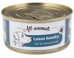All Animals DOG lazac darabok 90g, Teljes értékű, gabonafélék nélküli nedves eledel a 100%-ban bejelentett állati fehérjeforrással. Máriatövisolaj hozzáadásával. Lazacdarabok hozzáadott összetevők nélkül. Nem tartalmaz semmilyen kémiai vagy tartósító adalékanyagot. Alkalmas minden kutyafajta és korosztály számára. Összetevők: lazac. A termék szója- és gabonafélé